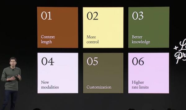 Sam Altman 表示团队一直在征求开发者的建议,对开发者关注的问题做了六大升级,分别是更长的上下文长度、更强的控制、模型的知识升级、多模态、模型微调定制和更高的速率限制。