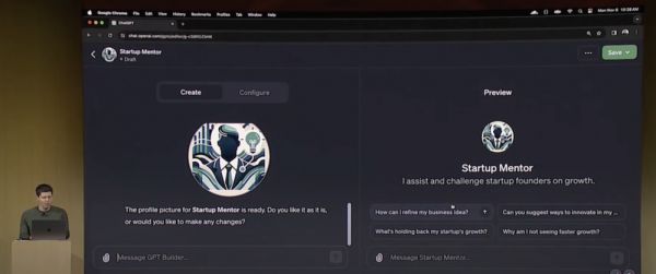接着,Sam Altman 打开了 GPT Builder,先打上一段对这个 GPT 的定义,类似于帮助初创公司的创始人思考他们的业务创意并获得建议,接着,在对话中,GPT Builder 自己生成了这个 GPT 的名字、图标,并通过与 Sam 对话的形式,询问 Sam 是否要对生成的名字和图标等进行调整。