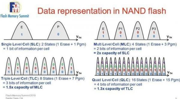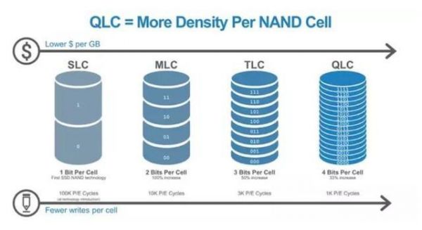 早期的SSD每个储存单元内储存1bit信息,称为单层储存单元也就是SLC,SLC只有0、1两种电压变化,结构简单,电压控制也快速,其特点就是寿命长,性能强,P/E寿命在万次以上,但是SLC有一个致命的缺点,就是成本非常高导致了价格奇高,如此一来SSD的普及就变得极其困难。