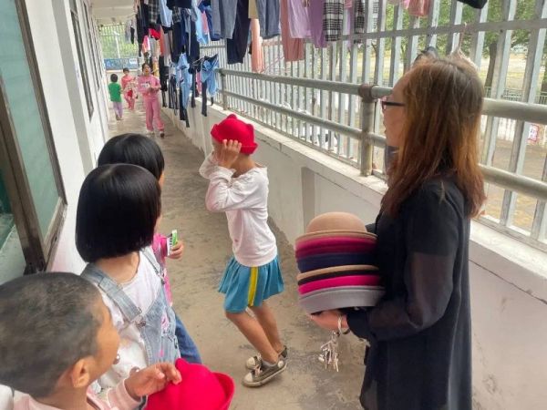 肖老师在给剪了寸头的女孩们发放志愿者寄来的帽子