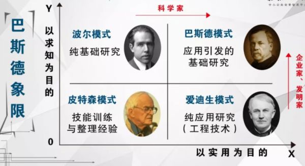 “巴斯德象限(Pasteur’s Quadrant)”,他认为基础与应用是结合的;纯基础研究是波尔象限,就是纯理论的;还有爱迪生象限,是纯应用的;还有一个叫皮特森象限,他的目标既不是想有理论上的突破,也不是想应用,完全是纯粹自由自在的研究,但是他也是在研究。