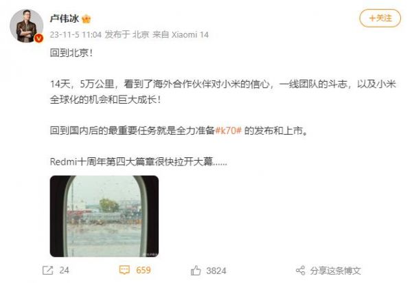 图/微博@卢伟冰就在那条微博下,卢伟冰还透露,回到国内后最重要的任务就是全力准备 K70,「Redmi 十周年第四大篇章很快拉开大幕…… 」尽管直到今天我们仍未知晓第一、第二篇章是什么,但却不得不为红米这个品牌而感慨。