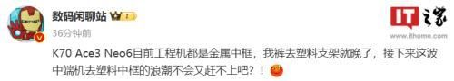 此外,该博主还透露,除了 Redmi K70 ,一加 Ace 3、realme GT Neo6 的工程机也采用了金属中框。