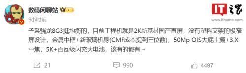 这位博主爆料称,这款新机的工程机配备2K 新基材国产直屏,并且采用没有塑料支架的极窄屏设计,机身为金属中框 + 新玻璃材质,配备 5000 万像素 OIS 大底主摄 + 3.X 中焦镜头,搭载 5000+mAh 电池 + 百瓦级闪充。