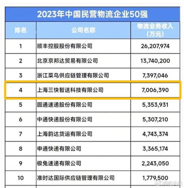 中国物流与采购联合会在不久前公布了“2023年中国民营物流企业50强”,榜单的前三名分别是顺丰、北京京邦达、浙江菜鸟供应链。专注于快递领域的顺丰、京东、菜鸟占了前三的位置。值得关注的是,上海三快智送科技冲到了榜单第4名,以约700.6亿的物流收入力压圆通、中通、韵达、申通和极兔。