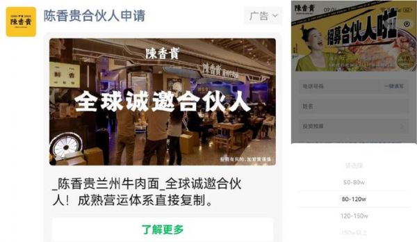 在这一背景下,寻找更多的资金和资源,变得迫在眉睫。姜军对媒体称,陈香贵不排斥加盟,“我觉得未来加盟一定是个趋势”,而从朋友圈的广告信息看,陈香贵要采取合伙人模式,公开招募,合伙开店,推进加盟。