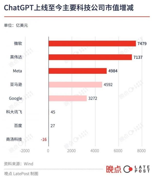 一开始被认为可能遭受巨大冲击的 Google,市值增加了 3200 多亿美元;靠着开源大模型追上来的 Meta,市值增加了近 5000 亿美元。