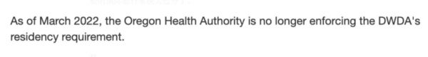 截止2022年3月,俄勒冈州健康部门不再执行《尊严死法》中的居住要求。来自俄勒冈州政府网站中有关PAS的页面。