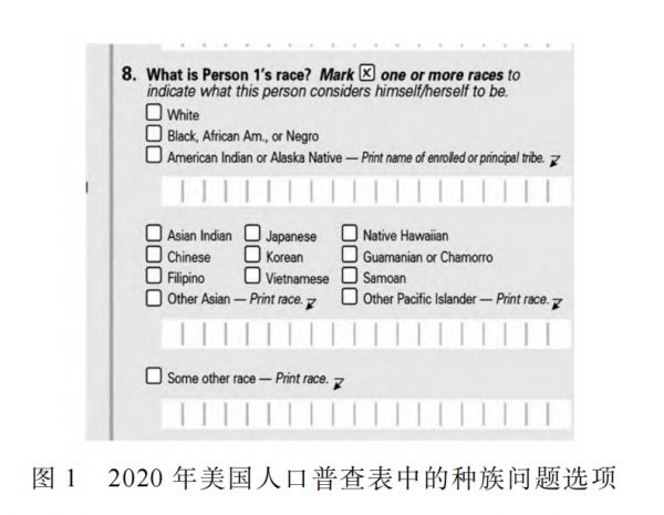 目前美国人口普查局遵守管理和预算办公室(Office of Management and Budget, OMB)关于族裔和民族的标准,划分为五类——白人、黑人或非裔美国人、美洲印第安人或阿拉斯加原住民 、亚洲人、夏威夷原住民或其他太平洋岛民 。其中的亚洲人可以进一步分为“Asian Indian”“Chinese”“Filipino”“Korean”“Japanese”等类型,回答者可根据自己的主观判断在族裔分类中选择一个或多个分类,如下图2所示。美国人口普查局使用的族裔信息反映了个体对族裔身份具有强烈主观性的自我认定(对于美国人口普查中移民与族裔信息的辨别可参考严八往期推送文章《美国的人口普查:种族、移民和驴象之争》)。