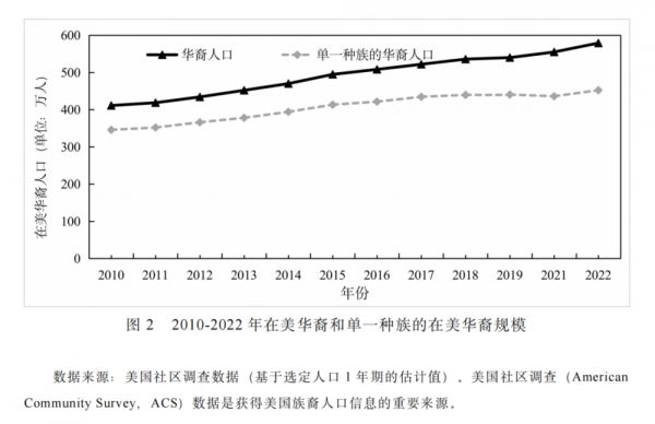 从在美华裔状况来看,根据2010年以来美国历次社区调查结果(如图2所示),在美华裔和单一种族的在美华裔规模趋于增加。2022年,在美华裔人口共579.0万人,其中单一种族的在美华裔为452.2万人。较2010年,在美华裔增加了167.9万,其中单一种族的在美华裔增加了106.5万。