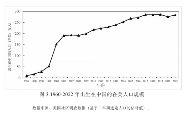从图3中在中国出生的美国人口规模可以看到,在1960年至1990年期间,出生地为中国的人口规模上升较为平缓;1990年后,在美中国移民的数量大规模上升,出生在中国人口的增长态势一直持续到2019年新冠疫情前,达到285万人的顶峰。后由于新冠疫情在全球范围内蔓延,国际流动人口减少,2021年出生在中国的人口规模略有下降,为275万人,2022年回升至283.3万人。