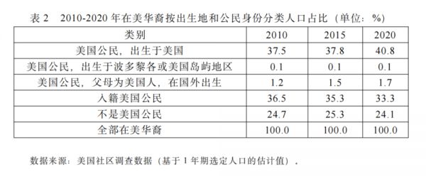 基于上文图2的结果,我们可以看到在美华裔已经突破500万。那么回到最初的问题之一,这些人可以称为“在美国的中国人”吗?我们在表2中按照出生地和公民身份划分的信息来识别这500多万人的特征,可以看到,2020年,全部在美华裔中,有42.6%为美国公民,33.5%为入籍美国公民,24.1%不是美国公民。同时,在美华裔的出生地也不一定为美国,可能出生在美国以外的其他国家或地区。