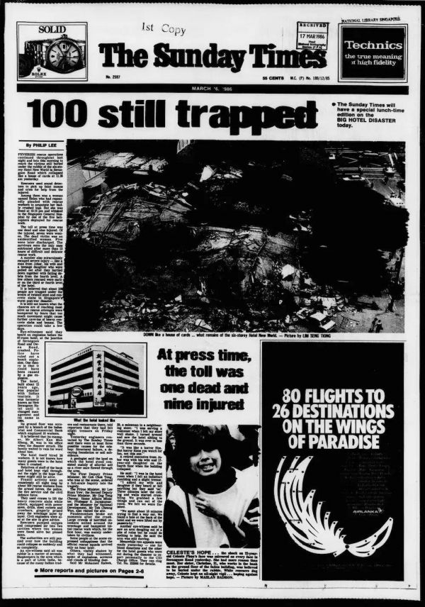 1986年,新加坡新世界酒店倒塌后报道,该事故造成33人丧生。|Wikipedia