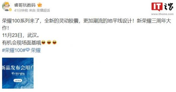IT之家 11 月 8 日消息,荣耀俱乐部今日发布 2023 荣耀新品发布会招募公告,活动时间为 11 月 23 日 13:30,地点位于武汉。