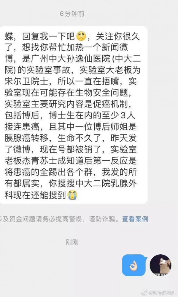 该微博网友爆料,苏士成团队有学生在上半年出现腹痛症状,并在就医后查出患癌,病理分析为胰腺未分化癌。此分型之占胰腺癌约2%,且多见于老年人。随后苏某在未与当事人沟通情况下将该学生踢出各个群聊。该用户还爆料,目前该乳腺癌研究中心已有多位学生确认患癌(三个博士一个博士后),包括胰腺癌+转移、罕见型乳腺癌、腹膜后肉瘤等。