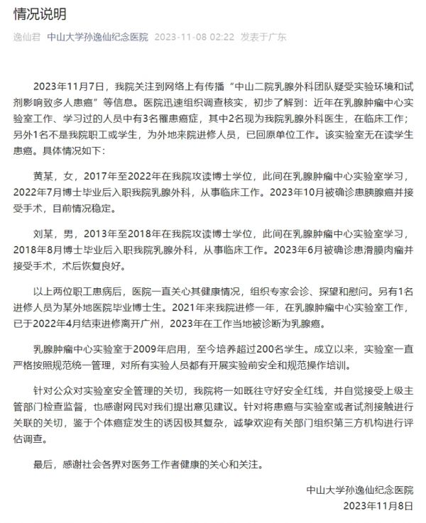 11月8日,中山二院与苏某本人在否认上述为假消息后不久,即再紧急发布情况说明:近年在乳腺肿瘤中心实验室工作、学习过的人员中有3名罹患癌症,其中2名现为我院乳腺外科医生,在临床工作;另外1名不是我院职工或学生,为外地来院进修人员,已回原单位工作。该实验室无在读学生患癌。