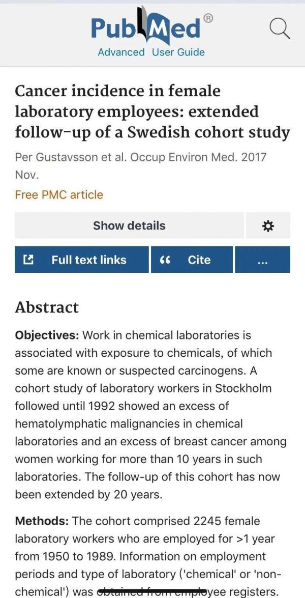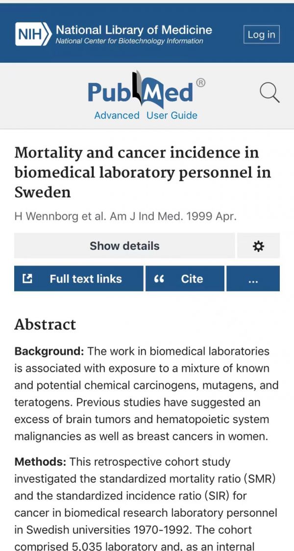 另据1999年《癌症原因控制》杂志上一篇题为“医学研究和常规实验室技术人员的死亡率和癌症发病率(瑞典)”的研究论文,在对1950年至1989年间受雇于斯德哥尔摩卡罗林斯卡研究所和卡罗林斯卡医院的2553名女性和男性实验室工作人员的死亡率和癌症发病率进行了调查。