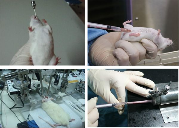 实验室工作人员常见给小鼠注射药物方式操作图(灌胃、腹腔、尾静脉及脑内注射)。