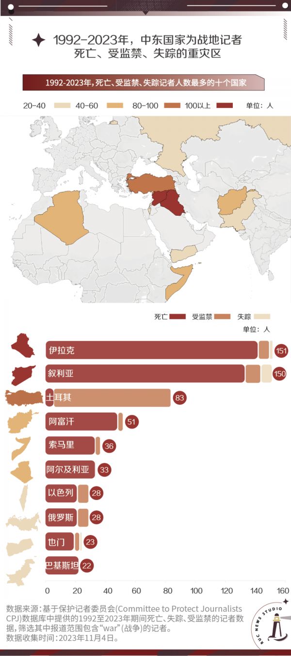 根据保护记者委员会(CPJ)的数据,1992至2023年,“战争(war)”有关的死亡、受监禁、失踪的记者共有835人。其中,伊拉克、叙利亚、阿富汗三地,占据死亡人数前三。而土耳其则最常见记者受监禁的消息,共有78条记录。