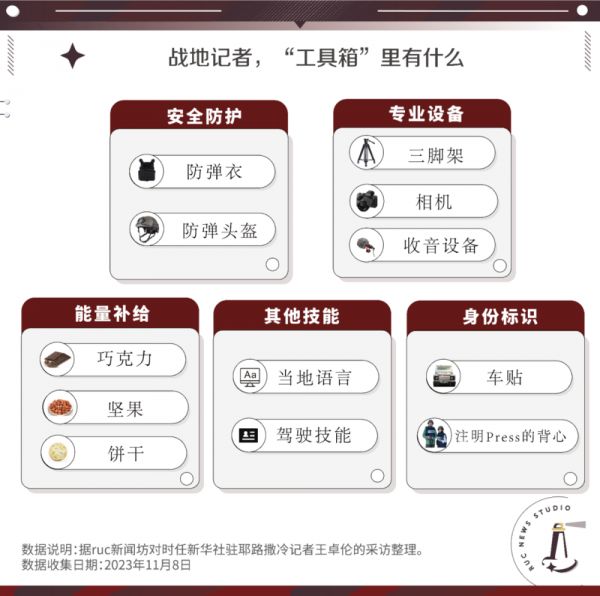 新华社驻耶路撒冷记者王卓伦告诉我们,在前线,防弹衣与防弹头盔是最重要的两种装备。每次开车去往现场时,“我都会把我的防弹衣和头盔放在副驾,如果有突发情况,比如突然有火箭弹来袭或者有爆炸发生,我至少可以把自己先武装起来。”