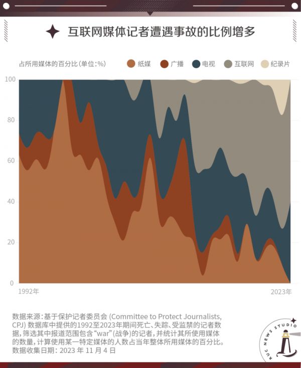 CPJ的数据也可以从侧面看出,战地记者们活跃的平台,正在逐渐从象征着传统媒体的纸媒、广播和电视转向互联网。