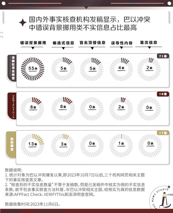 据我们对法新社事实核查、VERIFYThis(商业机构)和澎湃明查三个事实核查频道的统计,在巴以冲突的相关信息中,错误背景挪用、信息编造、冒名顶替等失实尤为高发。