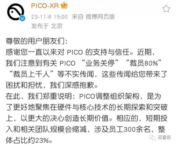 对此传闻,Pico今日发布的声明,否认了“裁员80%,涉及上千名员工”,但是也承认短期投入和相关团队规模会缩减,涉及员工300余名,整体占比约23%!