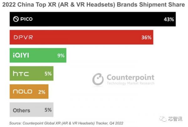 根据市场调研机构Counterpoint Research 的调查报告显示,2022 年的XR头戴式设备(包含AR 与VR)在中国的出货量超过110万台。其中,Pico是中国XR 市场的第一品牌,在2022年中国XR设备总出货量当中占比为43%。