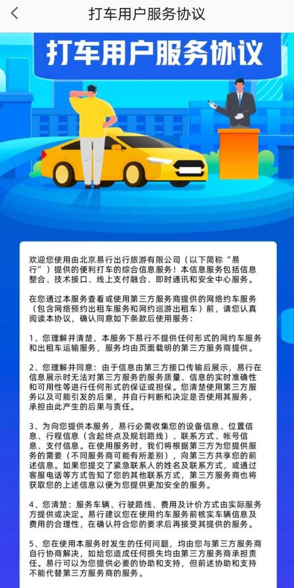 北京易行出行旅游有限公司(简称易行),是“高德地图”手机程序中的打车业务运营主体。在第五条中,其规定:“您在使用本服务时发生的任何问题,均由您与第三方服务商自行协商解决,如给您造成任何损失均由第三方服务商承担责任。”