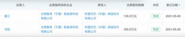 登记信息显示,2021年5月28日,注册资本700万元的长燃智享(宁夏)新能源科技有限公司两大股东刘凯(董事兼总经理)、霍江(董事长),分别将355万元、135万元的股权出质给了阿里巴巴。