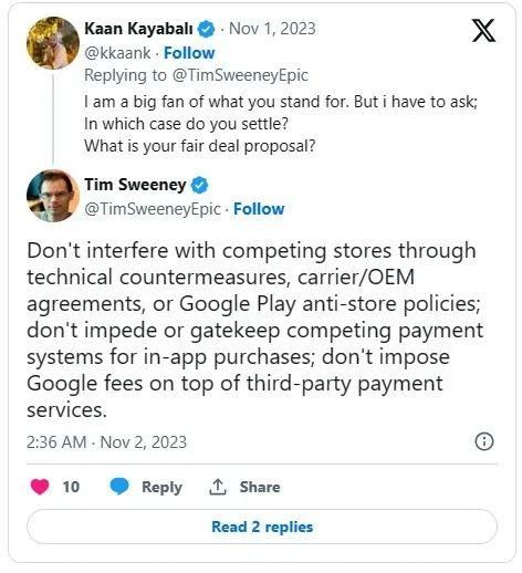 这条来自Sweeney的推文列举了这些所谓的和解要求,几乎就是其控诉谷歌的内容: