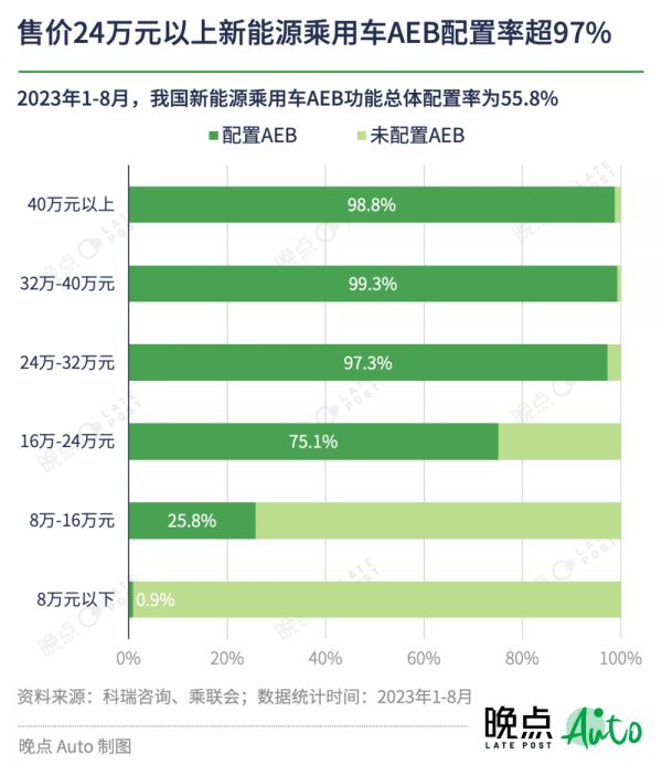 上述报告还显示,在 2023 年 1~8 月上市的新能源乘用车中,大多数已实现全系标配 AEB 功能。其中,售价在 24 万元以上的新能源乘用车对于 AEB 功能的普及率已超过 97% 。
