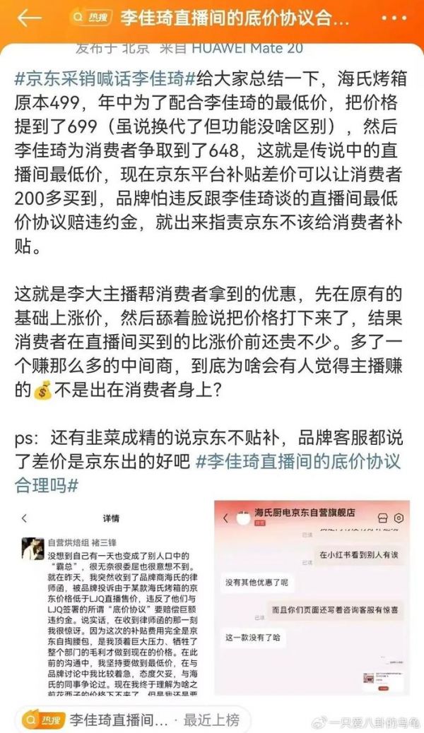 据京东采销人员检举,李佳琦涉嫌操纵海氏烤箱的价格。这款烤箱京东自己补贴,做全网最低价。