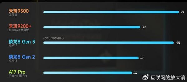 在GPU方面更是杀疯了,其跑分成绩能够达到99分,超过了高通骁龙8Gen3的95分,远远超过了A17 Pro的64分。可以说,如果不考虑高通联发科在单核成绩上和苹果天然的差距之外,这一次联发科已经算是非常大的提升了,全大核的设计带来的效果非常明显,在游戏方面的表现也非常坚挺,台积电N4P的工艺非常成熟,功耗发热也不会出什么差错,就目前在测试样机上来看,天玑9300就是一颗神U。