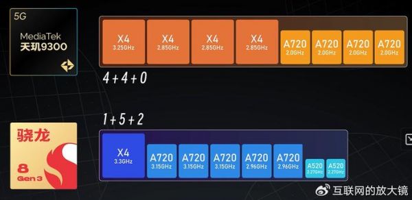 到了高通骁龙8Gen3上进一步变化,其采用了“1+5+2”的设计,包括一个X4超大核,三个A720大核以及两个A720大核(频率不同)再加上2个A520小核。其实天机9200上也采用了“1+3+4”的设计,包括一个X3大核,3个A715大核以及四个A510小核。