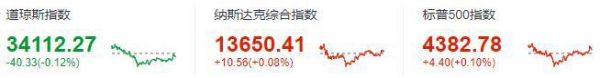 道琼斯指数收于34112.27点,下跌40.33点,跌幅0.12%;标准普尔500指数收于4382.78点,涨幅0.10%,连续第八个交易日上涨,创2021年11月以来最长的连续上涨;纳斯达克指数收于13650.41点,涨幅0.08%,连续第9个交易日上涨,创2021年11月以来最长的连续上涨。