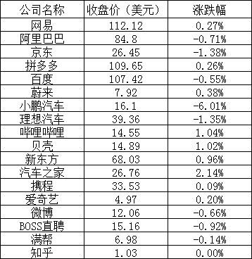 其它热门中概股中,汽车之家上涨2.14%,哔哩哔哩上涨1.04%,新东方上涨0.96%,携程上涨0.09%,知乎与上一交易日持平,BOSS直聘下跌0.92%,百度下跌0.55%,满帮下跌0.14%。