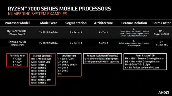 根据 AMD 的解释,四个数字中第一个数字表示年份,例如“7”是 2023 年,“8”是 2024 年,“9”则是 2025 年,虽然这种命名方式是为移动处理器引入的,但应该也适用于台式机才对。