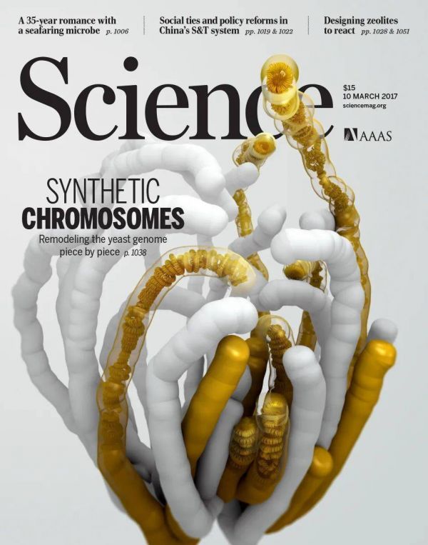 ▲2017年《科学》封面展示的酵母基因组结构模型,其中金色代表已经完成全合成的染色体;白色代表天然染色体(图片来源:《科学》官网;Credit: Valerie Altounian/Science)