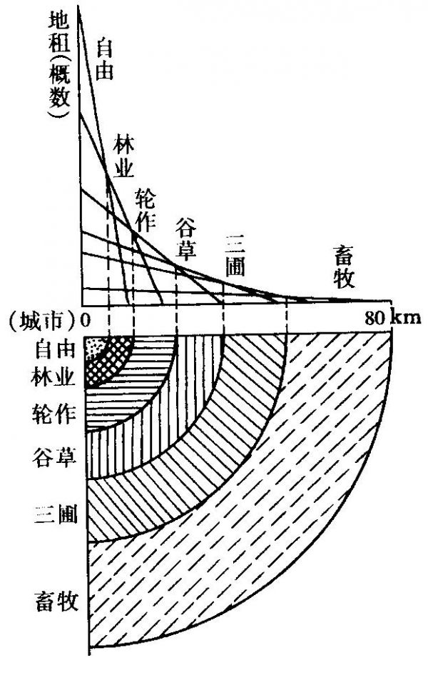杜能圈行程机制与圈层结构示意。1826年出版的《孤立国》奠定了农业区位理论的基础,也标志着区位理论的诞生。这一著名的杜能环同心圆结构深刻影响了此后的工业区位论、商业区位论等土地经济模型。