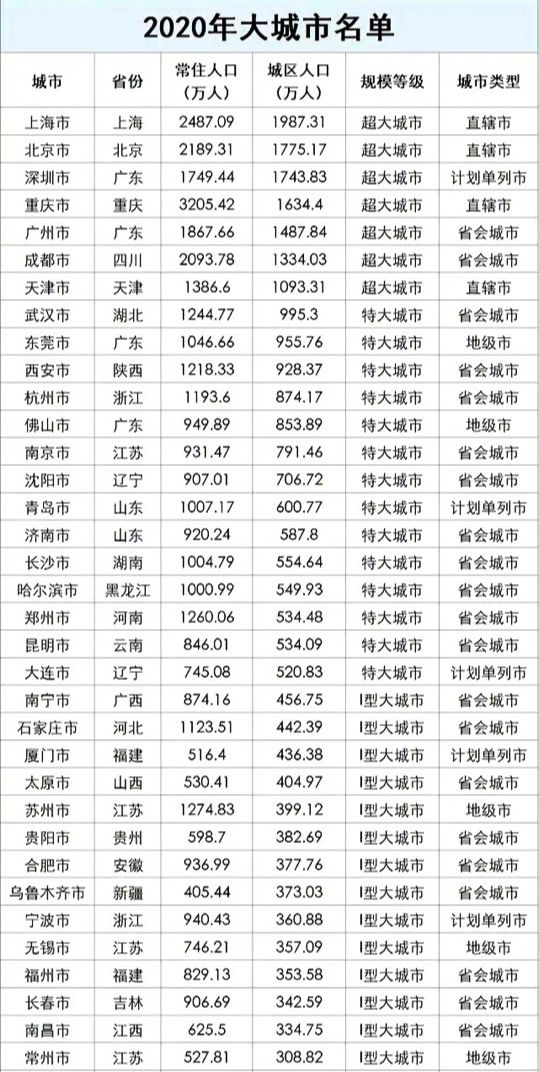 根据国务院于2014年下发的《关于调整城市规模划分标准的通知》,城区常住人口1000万以上的城市为超大城市,城区常住人口500万以上1000万以下的城市为特大城市,城区常住人口300万以上为I型大城市。图为2020年城区常住人口300万以上的大城市。(图片来源:网络)