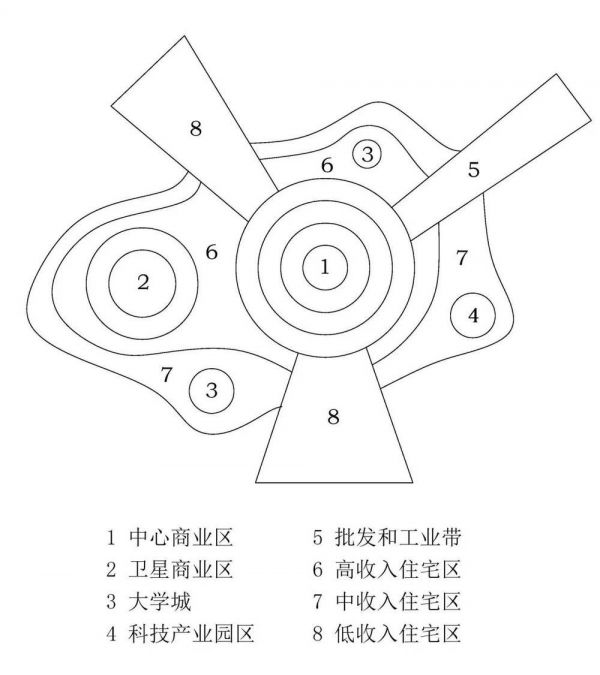 同心圆结构之外,西方城市结构学说也在此基础上发展出了扇形结构和多核心结构,成为目前三大最主流的城市结构理论。扇形理论(上图)作为对同心圆理论的修正,认为城市是以扇形的形式发展的,高房租住宅在高地、湖岸、海岸、河岸分布较广,且有不断向城市外侧扩展的倾向。多核心理论(下图)则强调,城市在发展过程中会出现多个商业中心,并产生新的极核,且其布局将受多种因素影响,不必然呈现圆形。