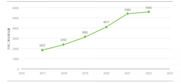 图说:2017~2022年中国快递行业碳排放总量,来源:绿色和平