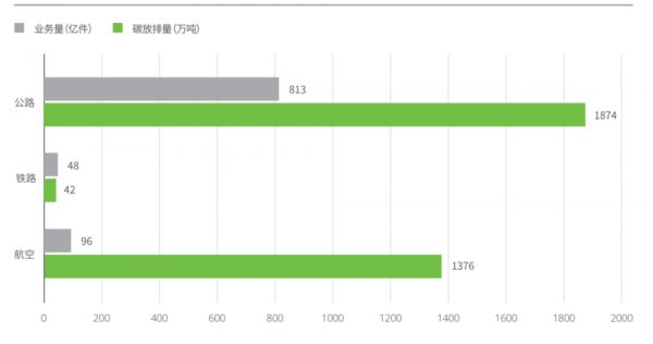图说:2022年三种快递干线运输方式的碳排放量与业务量,来源:绿色和平
