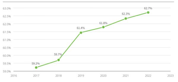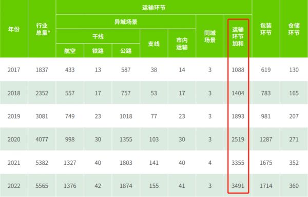 从2017年至2022年,仓储、包装和运输三个快递行业主要环节的碳排放量均有上升,其中运输环节的碳排放量占比最高,且比例还在不断扩大。