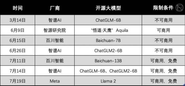 从时间上来看,百川是智源之后第一家开源的创业公司,且第一个宣布可免费商用。它开源不可商用的版本时,比智谱AI早九天;后来开源免费可商用的版本时,又比智谱AI早三天。