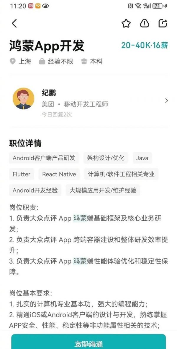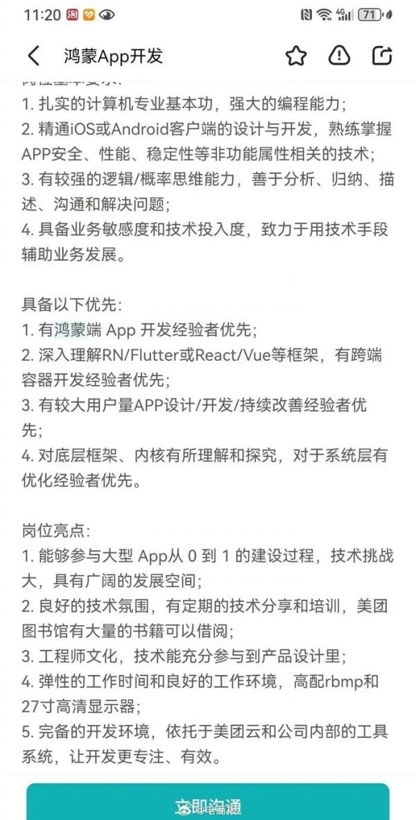 #美团拟开发鸿蒙系统App# 为开发美团鸿蒙App、大众点评鸿蒙App,美团已经开始招兵买马了。