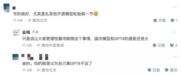 在作者与读者的互动中,作者也表示,希望“让大家更理性看待刷榜这个事情,很多模型和 GPT4 的差距还很大”。