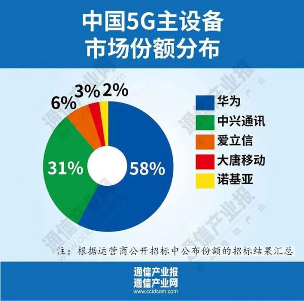 2020年至今,中国电信、中国联通、中国移动、中国广电一共进行了八次5G无线主设备的公开集中采购招标(以公示为标准),以及若干次单一来源采购。由于在单一来源及部分公开招标采购中,运营商未公布各中标厂商的具体中标份额,因此仅针对六次公开招标份额计算,华为中标份额最多,其次是中兴通讯,爱立信、大唐移动和诺基亚分列三到五位。