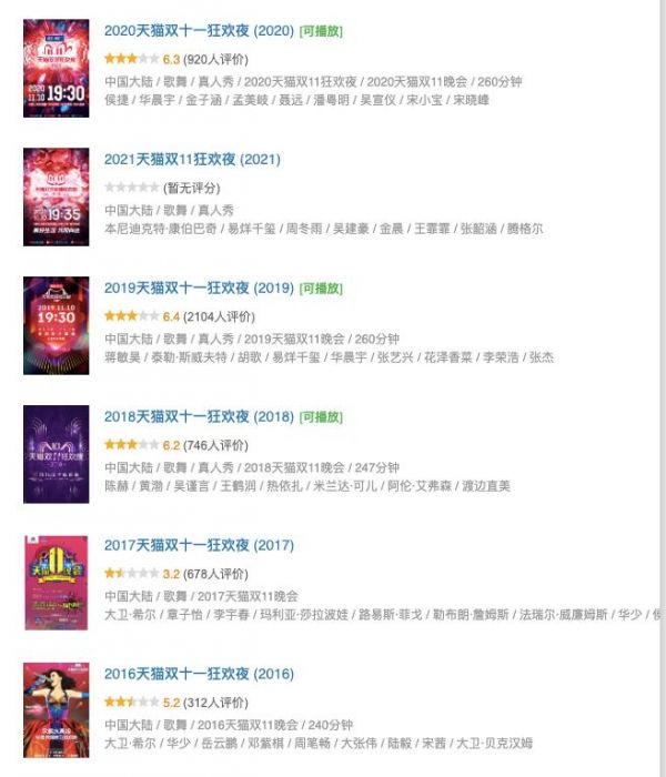 随着这类平台晚会的高频次出现,逐渐让大众产生审美疲劳,而平台方似乎也意识到这一点,而在2021年,双十一系列晚会就有退潮之态,在11月10日当天,只有天猫和拼多多两大平台播出相关的主题晚会。